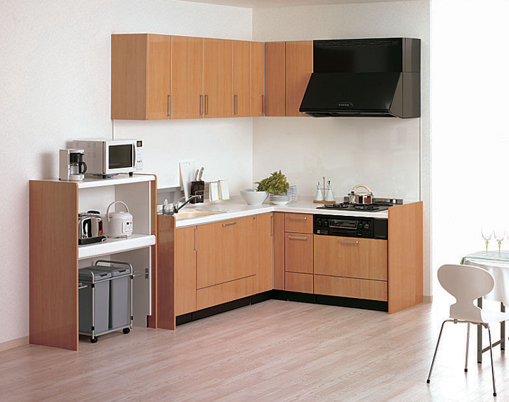 ワークトップをL字型に曲げた形となります。シンクとコンロを離して配置していますが、I型よりも作業動線が短くなるのが特徴です。部屋の角に設置することで、デッドスペースを減らす効果もあります。